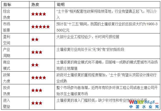 土壤修復(fù)行業(yè)尚處于從“無”到“有”的初始階段,土壤修復(fù)的商業(yè)模式尚不清晰,大部分企業(yè)工程經(jīng)驗少,長時間虧損經(jīng)營。然而,近兩年政府對土壤修復(fù)的重視程度增加,“土十條”有望從頂層設(shè)計推動行業(yè)發(fā)展,預(yù)計在“十三五”期間,我國土壤修復(fù)行業(yè)的總投資額大約為1900-3500億元,行業(yè)有望真正起飛。