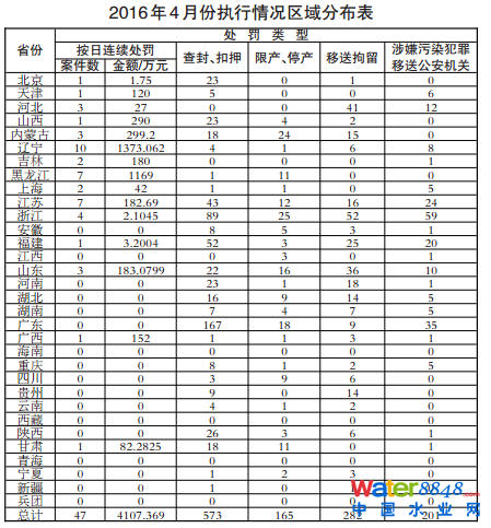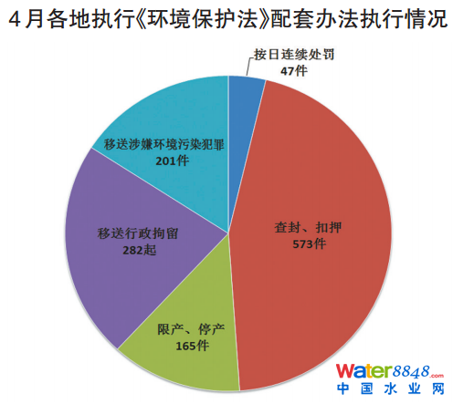 環(huán)境保護(hù)部環(huán)境監(jiān)察局局長(zhǎng)田為勇介紹說,4月全國(guó)范圍內(nèi)實(shí)施按日連續(xù)處罰案件共47件,罰款數(shù)額達(dá)4107.37萬元;實(shí)施查封、扣押案件共573件;實(shí)施限產(chǎn)、停產(chǎn)案件共165件;移送行政拘留共282起;移送涉嫌環(huán)境污染犯罪案件共201件。