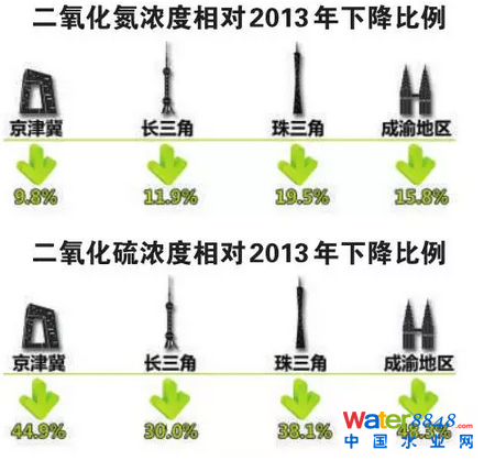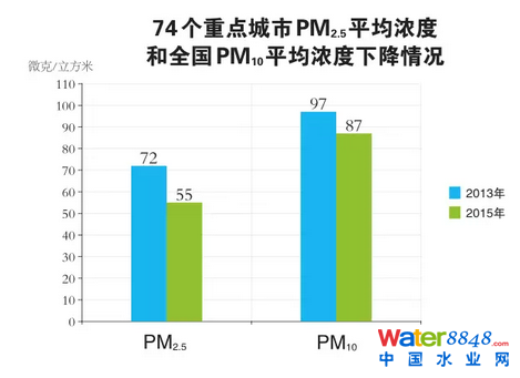 2015年,全國(guó)74個(gè)重點(diǎn)城市PM2.5平均濃度為55微克/立方米,相對(duì)于2013年的72微克/立方米下降23.6%;日均值超標(biāo)天數(shù)的比例由2013年的33.2%降至2015年的20.8%。全國(guó)PM10平均濃度(338個(gè)城市平均濃度為87微克/立方米),相對(duì)2013年(330個(gè)城市平均濃度97微克/立方米)下降10.3%;日均值超標(biāo)天數(shù)的比例由2013年的14.5%降至2015年的12.1%。74個(gè)重點(diǎn)城市共發(fā)生846天次重度污染和238天次嚴(yán)重污染,較2014和2013年降幅分別為28.1%、24.9%以及49.9%、63.7%。京津冀、長(zhǎng)三角、珠三角和成渝地區(qū)NO2濃度相對(duì)2013年分別下降9.8%、11.9%、19.5%和15.8%,SO2分別下降44.9%、30.0%、38.1%和48.3%。衛(wèi)星資料反演顯示,2013~2015年,全國(guó)NO2和SO2垂直柱濃度年均值和顆粒物光學(xué)厚度(AOD)總體呈下降趨勢(shì),與地面監(jiān)測(cè)數(shù)據(jù)分析結(jié)果一致。