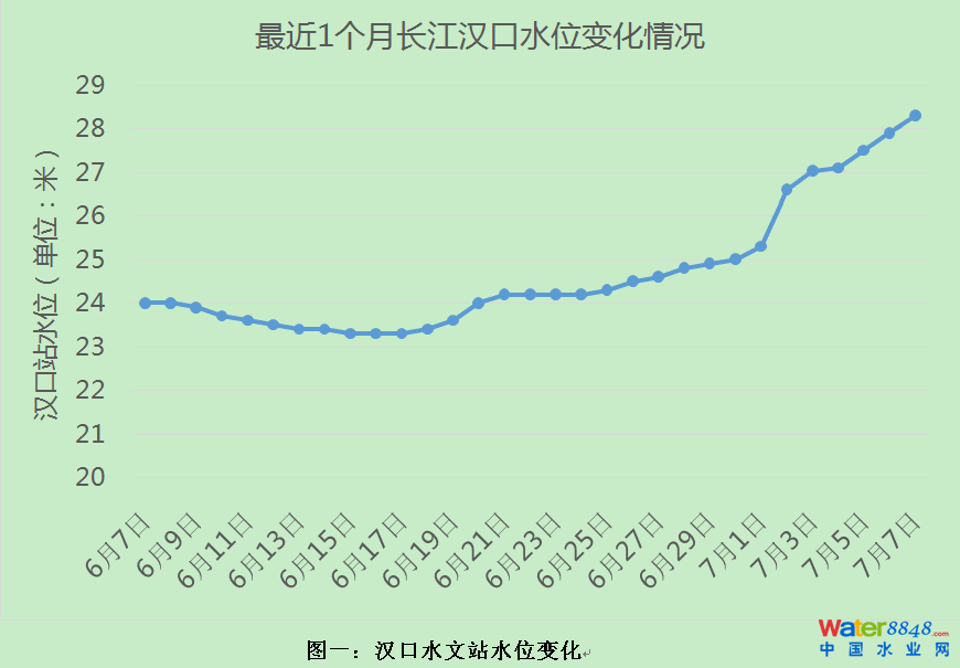 一是外江水位持續(xù)上漲,導(dǎo)致城市本身排水困難。根據(jù)長(zhǎng)江水文網(wǎng)的數(shù)據(jù),近一個(gè)月以來漢口水文站水位變化情況如圖表所示: