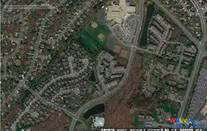 圖說:美國(guó)某典型住宅區(qū)開發(fā)中調(diào)蓄池的建設(shè)情況(注:以上衛(wèi)星影像圖片來自Google earth,該地點(diǎn)為北緯38°51’18.29”,西經(jīng)77°27’20.86”,3幅衛(wèi)星影像圖的時(shí)間分別為1990年,2002年和2015年)