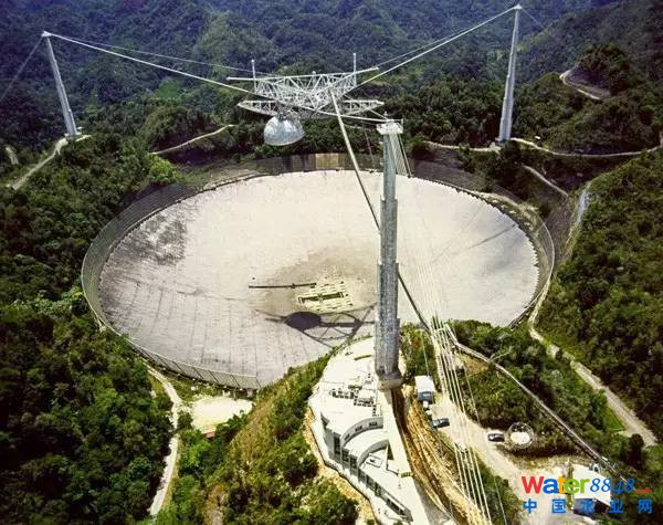 美國阿雷西博射電望遠鏡位于波多黎各島上的一座天然火山口當中,是目前世界上已建成的、最大單口徑球面射電望遠鏡。其反射面口徑為350米。波多黎各島位于赤道附近,這個位置對于跟蹤和觀測行星、脈沖星和其他天體十分理想。