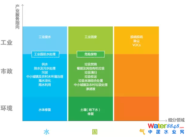 一個(gè)主要原因就是我們細(xì)分領(lǐng)域非常的復(fù)雜,E20提供一個(gè)九宮格分析方法,雖然不符合產(chǎn)業(yè)的分類。比如說我們這兩維,一個(gè)是水固氣,一個(gè)是工業(yè)與工業(yè)之物的市場(chǎng),一個(gè)是市場(chǎng)服務(wù)的市場(chǎng),還有一個(gè)是環(huán)境修復(fù)和環(huán)境維護(hù)為主要目標(biāo)的市場(chǎng)。在這個(gè)橫軸上的水固氣,其實(shí)可以通過他們每一個(gè)污染介質(zhì),或者污染媒介的特性掌握他在產(chǎn)業(yè)中的企業(yè),主要面對(duì)的或者這些技術(shù)所要面對(duì)的問題。比如大氣領(lǐng)域,很難對(duì)大氣直接進(jìn)行修復(fù)。一般存在的項(xiàng)目都是在我們右上角工業(yè)處理,他服務(wù)主要是EPC還有一個(gè)工程設(shè)備的空間。