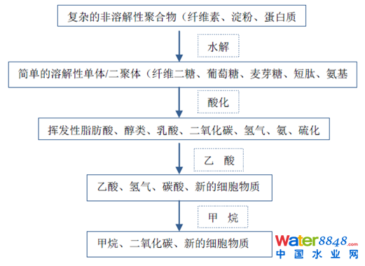 按照處理溫度不同,厭氧消化可以分為中溫消化和高溫消化兩種。高溫厭氧消化相對于中溫消化具有產(chǎn)氣率高、消化池體積小的優(yōu)勢,但是對耗能要求較高。我國當前普遍使用中溫消化。目前認為厭氧消化需要經(jīng)歷四個階段:分別是水解、酸化(發(fā)酵)階段,乙酸化階段,甲烷化階段。各階段之間既相互聯(lián)系又相互影響,各個階段都有各自特色微生物群體。