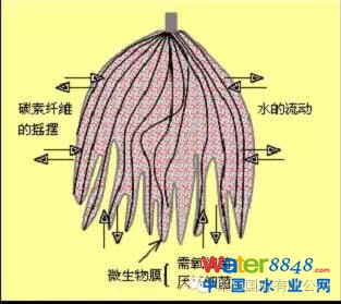 圖一生物碳纖維在凈化受污染水域和修復(fù)水環(huán)境生態(tài)示意圖