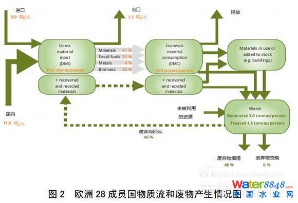 據(jù)歐洲環(huán)境署統(tǒng)計(jì),2006年歐盟鋼鐵材料的回收比例為42%,塑料為2%,其他材料的回收比例介于兩者之間。循環(huán)經(jīng)濟(jì)方面,歐洲開展的工作重點(diǎn)是實(shí)現(xiàn)物質(zhì)流的循環(huán);厥詹牧系男枨蠹捌涔⿷(yīng)情況,目前由歐盟委員會(huì)負(fù)責(zé),并且制定了原材料登記制度用以支持歐洲創(chuàng)新伙伴關(guān)系計(jì)劃。材料的輸入、廢物產(chǎn)生和回收過程如圖2所示。循環(huán)經(jīng)濟(jì)不可能完全實(shí)行閉路循環(huán)。一方面由于一些加工材料是用于提供能量,不可能完全回收;另一方面是產(chǎn)品和材料日趨復(fù)雜。例如,塑料和金屬合金的回收在技術(shù)上仍具有挑戰(zhàn)性。