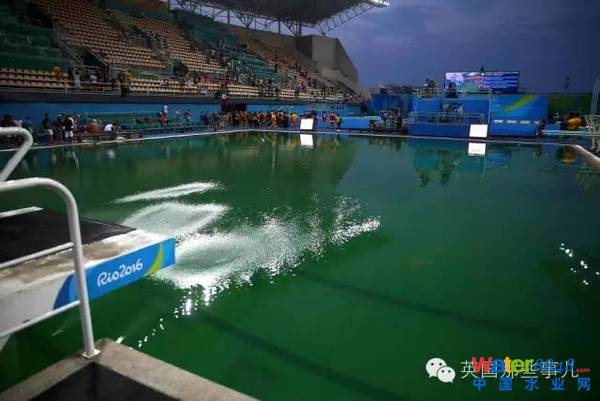 ▲里約當?shù)貢r間8月9日,在女子雙人十米跳水決賽中,瑪麗亞蓮克水中運動中心的賽場泳池里的水突然逐漸變綠;隨后幾天,水球池也開始變綠。