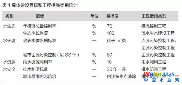 其次,在明確和分析區(qū)域現(xiàn)狀的基礎(chǔ)上,提出規(guī)劃戰(zhàn)略目標(biāo)和分類目標(biāo);通過對水生態(tài)、水安全、水環(huán)境和水資源各項(xiàng)子目標(biāo)的分解,最終實(shí)現(xiàn)海綿城市規(guī)劃目標(biāo)。