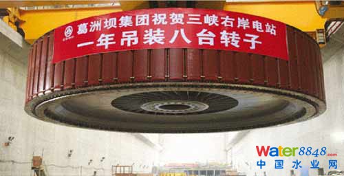 2010年7月,三峽電站機(jī)組實(shí)現(xiàn)了電站1820萬kW滿出力168小時(shí)運(yùn)行試驗(yàn)?zāi)繕?biāo)(日發(fā)電量可突破4.3億kWh電,占當(dāng)時(shí)全國日發(fā)電量的5左右)。1949年,中國總發(fā)電量僅為43億kWh【圖為】三峽水電站右岸第8臺(tái)轉(zhuǎn)子吊裝。