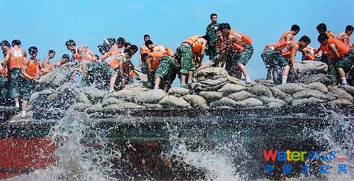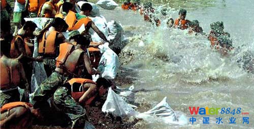 1998年長江洪水是繼1954年以來的又一次全流域性大洪水,長江中下游干流沙市至螺山、武穴至九江共計(jì)359km的河段水位超過了歷史最高水位。鄱陽湖水系五河、洞庭湖水系四水發(fā)生大洪水后,長江上中游干支流又相繼發(fā)生了較大洪水,長江上游接連出現(xiàn)8次洪峰。據(jù)分析:1998年7~8月,長江上游來水量略大于1954年,中、下游水量略小于1954年【圖為】1998年8月25日,沈陽軍區(qū)某舟橋團(tuán)官兵奮力封堵被洪水沖垮的堤壩