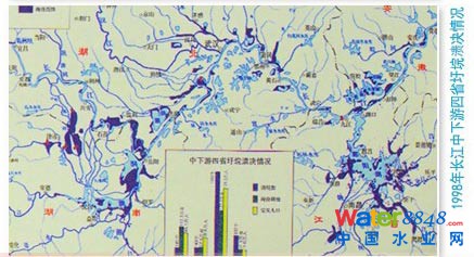 1954年,長江中下游地區(qū)雨季提前到來,洪水發(fā)生也比一般年份早,洞庭湖、鄱陽湖水系于4月份即進(jìn)入汛期,長江中下游干流高水位持續(xù)時(shí)間長,漢口至南京江段水位自6月25日起全線超過警戒水位,超警歷時(shí)一般在100天~135天,中下游洪水位全線突破當(dāng)時(shí)的歷史最高值。長江中下游洪水與川水遭遇,形成全流域性大洪水。該年該年長江上游宜昌站最大洪峰流量66 800 m3/s,在無奈情況下考慮荊江分洪方案,雖保住武漢市,但受災(zāi)人口1890萬,被淹房屋427.66萬間,淹死3.4萬人,淹沒良田317萬公頃,受災(zāi)縣市123個(gè),京廣鐵路不能通車達(dá)100天,損失數(shù)十億元。在荊江采取分洪措施后,沙市最高水位仍達(dá)44.67m;中游漢口站最高水位29.73m,超過1931年的最高水位,相應(yīng)流量76 100 m3/s;下游大通站最高水位16.64m,相應(yīng)流量92 600 m3/s。最大30天洪量,1954年分洪潰口水量達(dá)1 023億m3【圖為】1954年的武漢洪水,漢口著名的標(biāo)致性建筑物——江漢關(guān)的街道上已成澤國