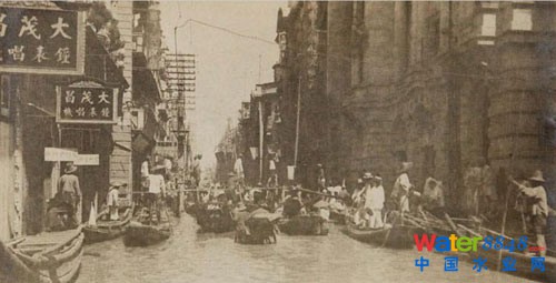 洪水,每次特大洪水時(shí),宜昌以下的長江荊州河段(荊江)都要采取分洪措施,淹沒鄉(xiāng)村和農(nóng)田,以保障武漢的安全。在三峽工程建成后形成的水庫,正常蓄水位高程175m,設(shè)計(jì)預(yù)留的防洪庫容為221.5億m3,其巨大的庫容量所提供的調(diào)蓄能力將能使下游荊江地區(qū)抵御百年一遇的特大洪水,可使江漢平原1500萬人口和150萬公頃耕地免受洪水威脅,在遭遇特大洪水時(shí)可避免發(fā)生大量人口傷亡的毀滅性災(zāi)害,也有助于洞庭湖的治理和荊江堤防的全面修補(bǔ)。三峽水利樞紐最大泄洪能力為116 110 m3/s,可削減的洪峰流量達(dá)27 000~33 000 m3/s,屬世界水利工程之最。1931年的長江洪水,受災(zāi)面積達(dá)13萬km2,淹沒農(nóng)田339萬公頃,被淹房屋180萬間,受災(zāi)民眾2 855萬人,被淹死亡者達(dá)14.5萬人,估計(jì)損失13.45億銀元【圖為】1931年7月以后,武漢三鎮(zhèn)雨水連綿,長江水位逐日增高,而當(dāng)局又疏于防范,終致漢口城區(qū)被江水淹沒,人員財(cái)產(chǎn)損失極其慘重。照片紀(jì)錄了武漢被江水淹沒街道的實(shí)景。