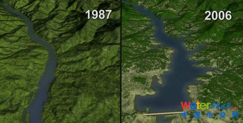 三峽大壩建成前(1987年)后(2006年)長江三斗坪段水域變化圖。