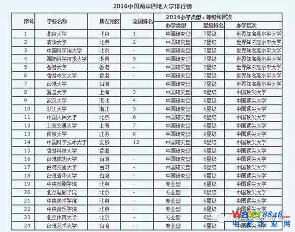 北京體育大學(xué)、中央音樂學(xué)院、中央美術(shù)學(xué)院、北京電影學(xué)院、中央戲劇學(xué)院和臺灣藝術(shù)大學(xué)等6所專業(yè)型高校榮膺2016中國六星級大學(xué),躋身世界高水平大學(xué)、中國頂尖大學(xué)行列。艾瑞深研究院名譽(yù)院長、中國綜合大學(xué)排行榜創(chuàng)始人、中南大學(xué)蔡言厚教授指出,北大、清華、國科大、港大、臺大等榮膺2016中國七星級、六星級的研究型大學(xué)其綜合實(shí)力和辦學(xué)水平屬于“中國兩岸四地大學(xué)第一方陣”,均是世界高水平大學(xué)、中國頂尖大學(xué),是目前中國兩岸四地創(chuàng)建世界一流大學(xué)的排頭兵和核心力量。