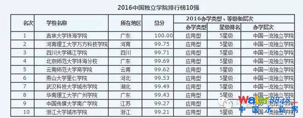 2016中國獨(dú)立學(xué)院排行榜10強(qiáng)