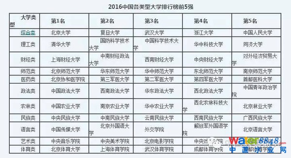 2016中國各類型大學(xué)排行榜前5強(qiáng)