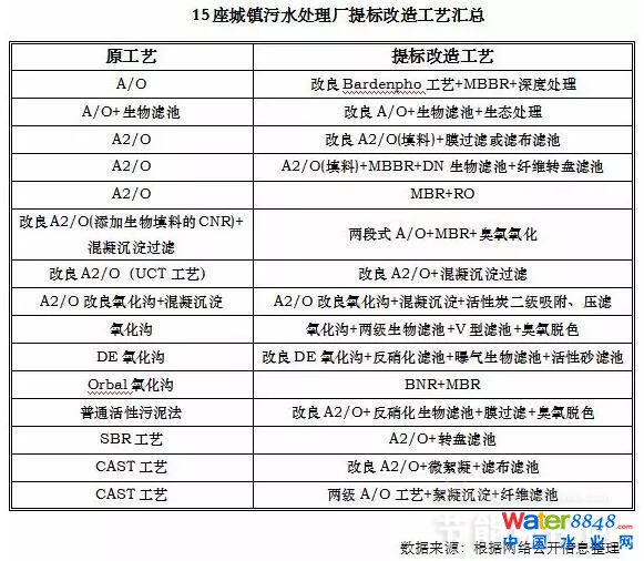 另外, 通過互聯(lián)網(wǎng)公開信息報道匯總整理了15座城鎮(zhèn)污水處理廠提標改造技術(shù)工藝,該小樣本數(shù)據(jù)顯示目前有一定比例的城鎮(zhèn)污水處理提標改造為在原有技術(shù)工藝基礎上,在二級處理階段,強化生物處理或增加生化處理,在三級處理階段以深度過濾為主;另外還有一部分為MBR工藝。