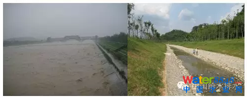 防洪河道以保證洪水順利排放為主,斷面按照5年一遇洪水位為分界線,5年一遇洪水位以下采用人工硬質護岸,增強過流能力,防止堤岸被過度沖刷,節(jié)省建設用地;5年一遇洪水位以上采用生態(tài)自然護岸,滿足景觀要求。對主要承擔城市內部排水功能和景觀功能的河道,全部采用生態(tài)護岸,雨水以蓄滯為主,緩釋慢排。北川新縣城河道建設實景見圖3。