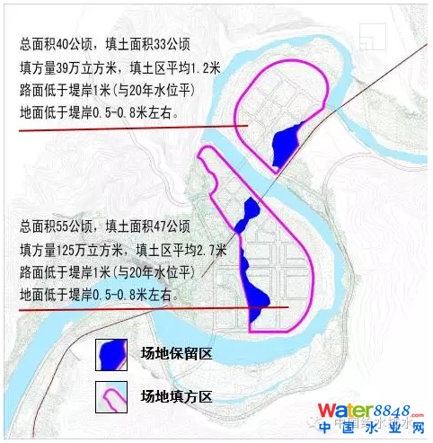 規(guī)劃建設過程中,利用周邊丘陵場地平整時多余土方,將現(xiàn)狀場地整體高程提高3~4米,不低于青竹江20年一遇洪水高程,在合理開發(fā)鎮(zhèn)區(qū)周邊建設用地的同時,保證了土方的合理利用,保證了梁沙壩和史家壩排水防澇安全。竹園鎮(zhèn)區(qū)道路、場地土方工程量與洪水位的關系見圖4。