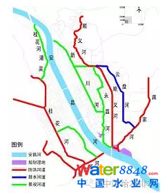 四川省綿陽市北川新縣城,汶川大地震后唯一異地新建的縣城,原址為安昌河的山前沖積帶,西部典型的河壩地區(qū),規(guī)劃占地面積7平方公里,現(xiàn)狀建成區(qū)面積5平方公里。北川新縣城建設過程中,水系構建以打造羌族特色的水系景觀為理念,利用其內部天然水系與農(nóng)業(yè)灌渠規(guī)劃了8條主要水系,其中以防洪為主要功能的4條,以排水為主的2條,以景觀為主的2條,具體見圖2。