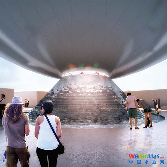 圓球的表面是由透明、發(fā)光的太陽能聚光器組成的,它提供能量給內(nèi)部的水循環(huán),圓球的內(nèi)部有一個太陽能蒸發(fā)器,它通過蒸發(fā)和冷凝作用來產(chǎn)生淡水。經(jīng)過淡化的水直接倒到底下的噴泉里,這也是對光和水對于生命意義的一次藝術(shù)性的詮釋。