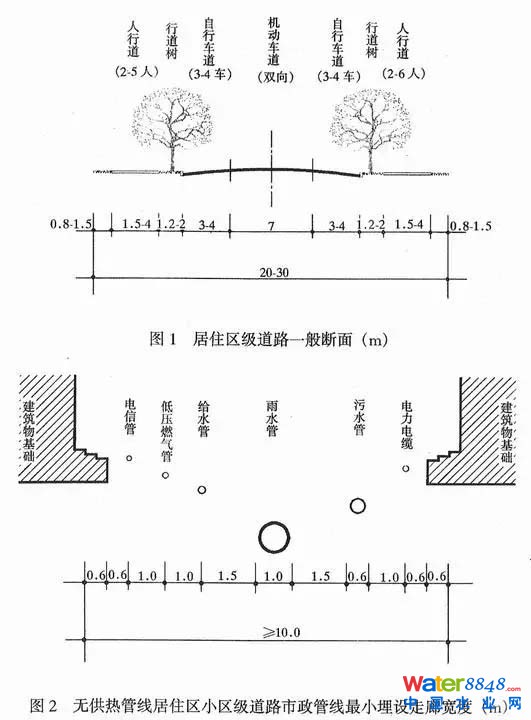 小區(qū)級道路車行道的最小寬度為6m,如兩側(cè)各安排一條寬度為1.5m的人行路,總寬度為9m,即可滿足一般功能需要。同時,小區(qū)級道路往往又是市政管線埋沒的通道,在無供熱管線的居住區(qū)內(nèi),按六種基本管線的最小水平間距,它們在建筑線之間的最小極限寬度約為10m(圖2),此距離與小區(qū)級道路交通車行、人行所需寬度基本一致。