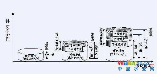 圖1引自《日本下水道設(shè)計指南》(2001年版)中日本橫濱市鶴見川地區(qū)的“不同設(shè)計重現(xiàn)期標(biāo)準(zhǔn)的綜合應(yīng)對措施”。圖1反映了該地區(qū)從單一的城市排水管道排水系統(tǒng)到包含雨水管渠、內(nèi)河和流域調(diào)蓄等綜合應(yīng)對措施在內(nèi)的內(nèi)澇防治系統(tǒng)的發(fā)展歷程。當(dāng)采用雨水調(diào)蓄設(shè)施中的排水管道調(diào)蓄應(yīng)對措施時,該地區(qū)的設(shè)計重現(xiàn)期可達10年一遇,可排除50mm/h的降雨;當(dāng)采用雨水調(diào)蓄設(shè)施和利用內(nèi)河調(diào)蓄應(yīng)對措施時,設(shè)計重現(xiàn)期可進一步提高到40年一遇;在此基礎(chǔ)上再利用流域調(diào)蓄時,可應(yīng)對150年一遇的降雨。