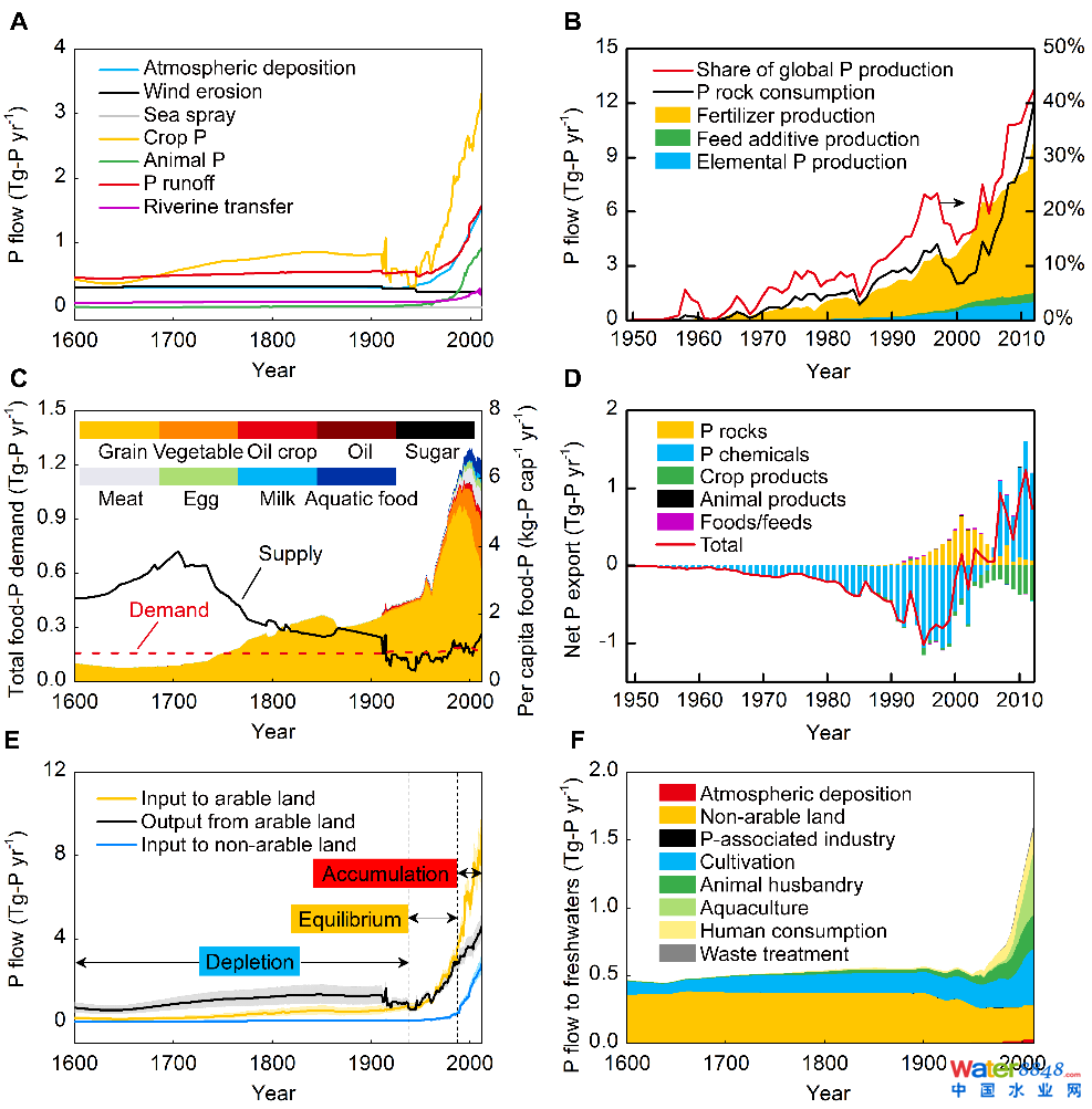 圖 1. (A), 中國(guó)主要磷流變化;(B), 磷礦石生產(chǎn)與消費(fèi)結(jié)構(gòu)變化;(C), 主要食物磷需求變化;(D), 磷礦石及主要含磷產(chǎn)品進(jìn)出口變化;(E), 土壤磷庫(kù)存變化;(F), 地表水體磷輸入變化