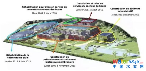 建于1977年的這座污水廠歷經(jīng)多年風(fēng)雨,已不能滿足歐盟的排放標(biāo)準(zhǔn)。相關(guān)的水務(wù)單位SIAUBC (Syndicat Intercommunal d’Assainissement Unifiédu Bassin Cannois)在2009年跟里昂水務(wù)Lyonnaise des Eaux (負(fù)責(zé)運行)和它的合作伙伴SUEZ、Triverio和GTM(負(fù)責(zé)設(shè)計和建造)簽訂了協(xié)議,來建造和運行一座新的污水廠,該廠命名為Aquaviva,將處理戛納地區(qū)30萬的人口當(dāng)量(具體包括了Auribeau-sur-Siagne, Cannes, Le Cannet, Mandelieu-la Napoule, Mougins, Pégomas, La Roquette-sur-Siagne and Théoule-sur-Mer),設(shè)計能力為86000 m³/d。
