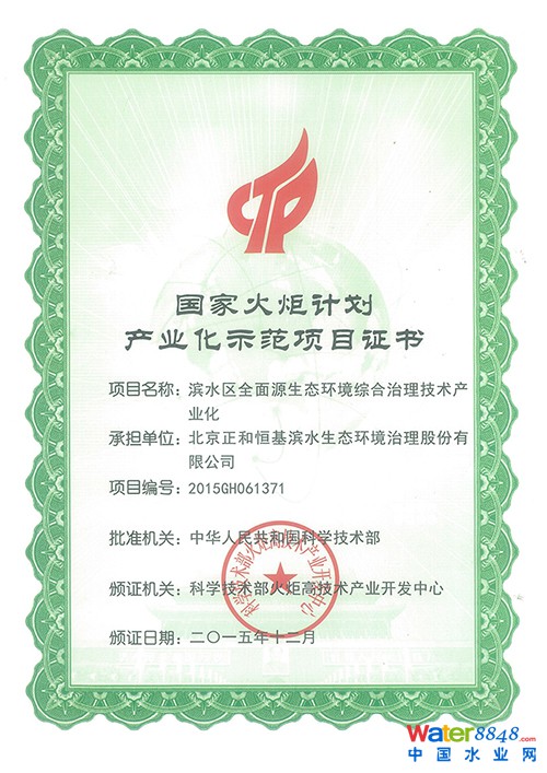 正和恒基“濱水區(qū)全面源生態(tài)環(huán)境綜合治理技術(shù)產(chǎn)業(yè)化”項(xiàng)目榮獲 “國家火炬計(jì)劃產(chǎn)業(yè)化示范項(xiàng)目證書”