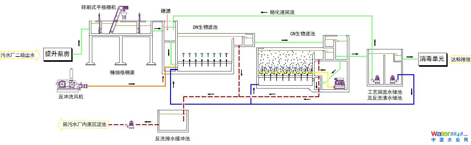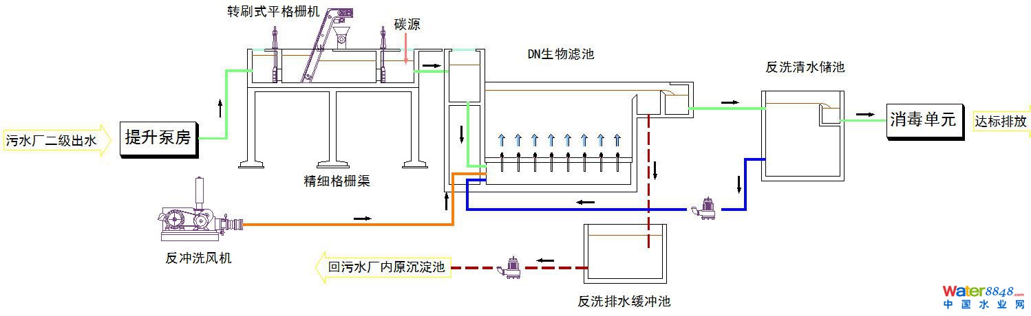 生活污水經(jīng)過提升泵房,進(jìn)入格柵去除粗大漂浮、懸浮物后,采用上向流進(jìn)入深床濾池,利用污水中的硝態(tài)氮進(jìn)行反硝化作用、并消耗降解COD和BOD,若來水碳源不足,需外部投加碳源,出水總氮滿足一級(jí)A標(biāo)準(zhǔn)。