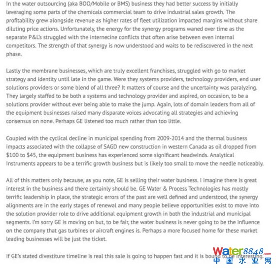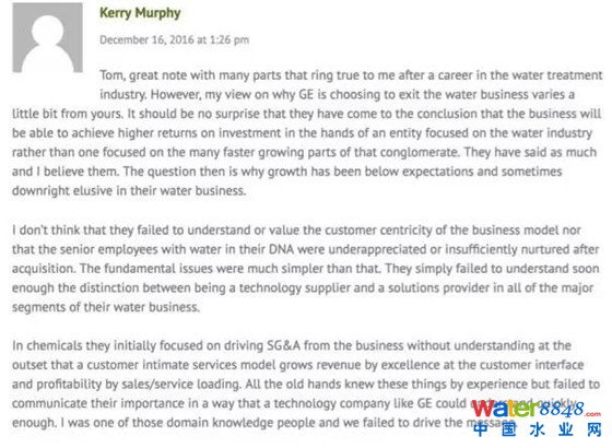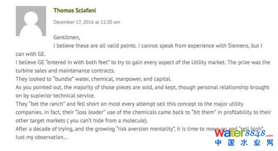 GE出售旗下全部水處理業(yè)務(wù)的新聞已經(jīng)過了兩個月了,圣誕馬上就到了,估計圣誕老人也幫不了GE在這幾天找到最后的買家。留意這個新聞的同行應(yīng)該也看過這樣那樣的報道。近日小編發(fā)現(xiàn)來自美國Sustainable Resource Technologies公司的創(chuàng)始人Tom Volinchak撰寫的一篇分析GE退出水務(wù)市場的文章在領(lǐng)英的水處理圈躥紅。小編把它翻譯成中文供大家閱讀。水平有限,如有錯誤,敬請指正: