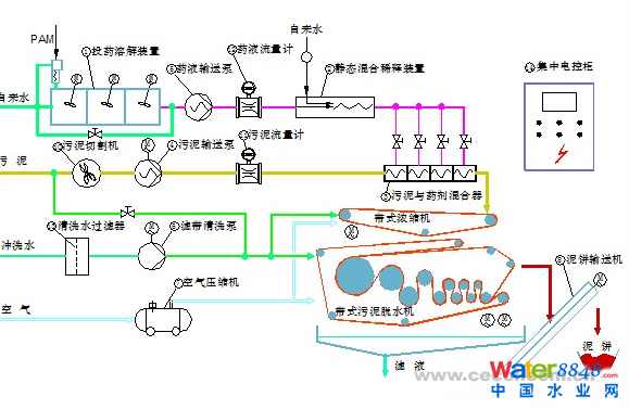污泥是特別為廢水處理的污泥脫水而設(shè)計(jì)的雙濾帶式濃縮脫水一體機(jī)。由污泥調(diào)理裝置、前處理旋轉(zhuǎn)離心裝置、污泥勻配系統(tǒng)、重力脫水區(qū)、楔型壓縮區(qū)、預(yù)壓脫水區(qū)、低壓脫水區(qū)、剪力脫水區(qū)、自動(dòng)清洗裝置、濾布傳動(dòng)裝置、濾布自動(dòng)校正系統(tǒng)、濾布保護(hù)裝置、緊急保護(hù)裝置及輔助設(shè)備等組成。 高分子聚合物及污泥經(jīng)由高分子加藥機(jī)及污泥泵注入污泥凝集混合器,在混合器混合后經(jīng)由污泥均配裝置均勻散布注入于濾帶上。經(jīng)重力脫水區(qū)、楔型壓縮區(qū)、預(yù)壓脫水區(qū)、低壓脫水區(qū)、剪力脫水區(qū)等一系列的壓濾作用,沿著濾帶行進(jìn)方向持續(xù)加壓于污泥上,直到的污泥餅由排放口掉落。
