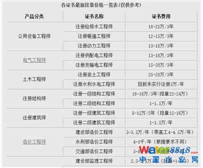 注冊會計師,4萬~4.5萬/年(掛法人);注冊一級消防工程師,8萬/年;注冊一級建筑工程師,8萬~12萬元/2年;注冊巖土工程師,25萬~28萬元/3年……近日,一張名為“2016年各證書最新掛靠價格一覽表”的表格流傳網(wǎng)絡(luò),一些通過率低的資格證書掛靠費甚至超過一些職業(yè)的年均工資水平。