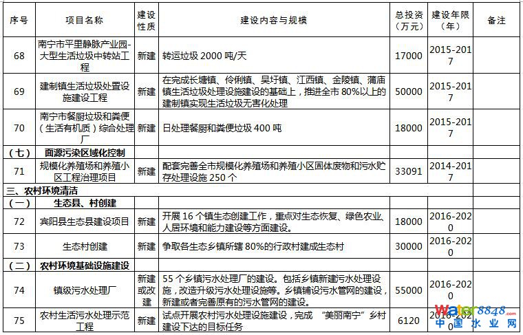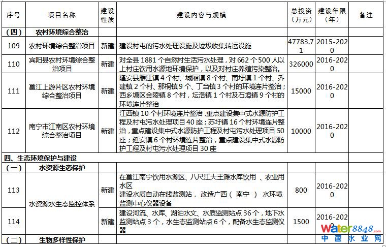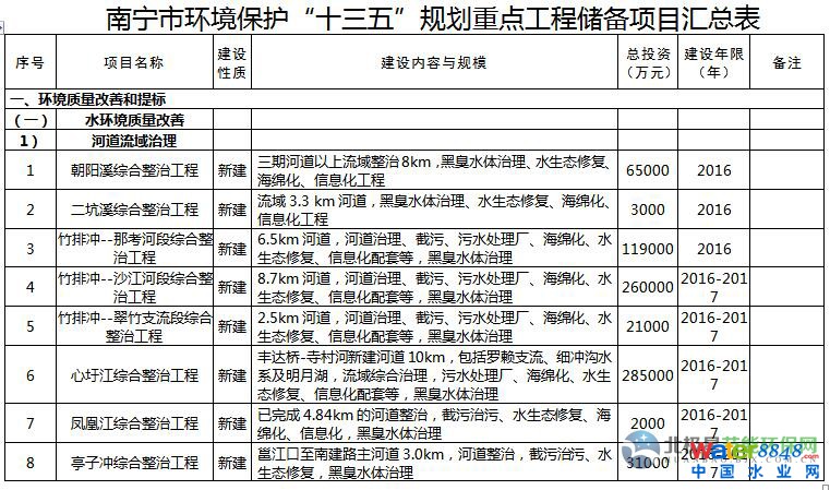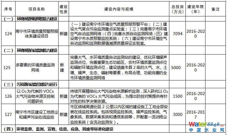 日前,《南寧市環(huán)境保護“十三五”規(guī)劃》已經(jīng)印發(fā)。規(guī)劃以提高環(huán)境質(zhì)量為主線,緊緊圍繞大氣、水體、土壤污染防治三大戰(zhàn)役,深入開展大氣、水、土壤環(huán)境質(zhì)量改善項目。規(guī)劃提到,開展大氣污染防治,全力推進工業(yè)大氣二氧化硫和氮氧化物減排。全面推進清潔生產(chǎn),推動工業(yè)鍋爐脫硫工作,以熱電聯(lián)產(chǎn)、工業(yè)園區(qū)統(tǒng)一供熱或清潔能源替代小型燃煤鍋爐,規(guī)模在20噸/小時以上的燃煤鍋爐要實施煙氣脫硫改造。持續(xù)推進火電、有色冶煉、石油石化、水泥、陶瓷等行業(yè)脫硫脫硝工程,在火電、水泥、冶金、制糖等行業(yè)推行低氮燃燒技術(shù)。本規(guī)劃共列出重點工程142項,總投資估算396.83億元,涉及大氣污染治理、污水處理、垃圾處理等環(huán)保項目。詳情如下: