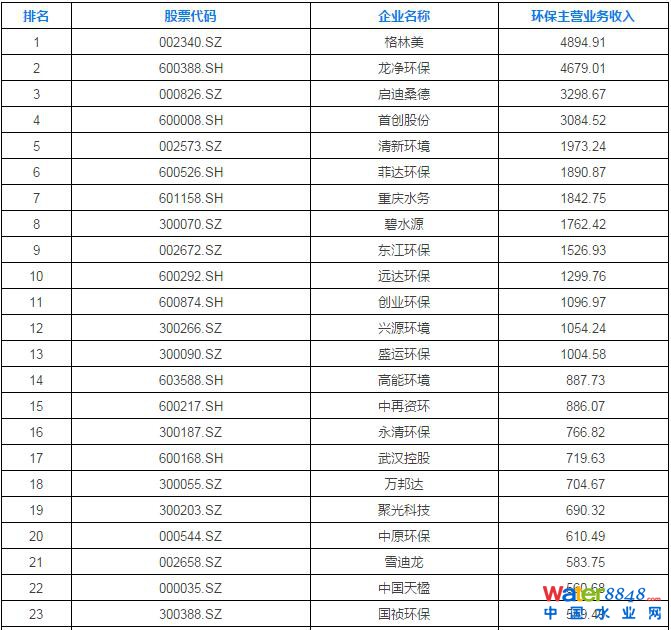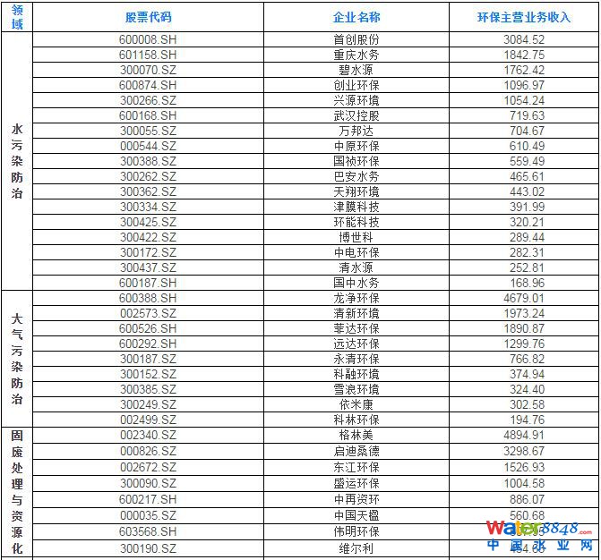 表2 2016年1-3季度主營(yíng)環(huán)保上市企業(yè)細(xì)分領(lǐng)域環(huán)保主營(yíng)業(yè)務(wù)收入排名(單位:百萬(wàn)元)