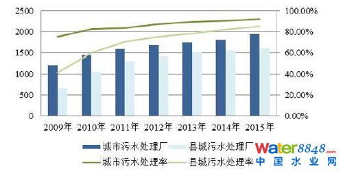 2009-2015年,我國城市、縣城污水處理的變化情況如下:
