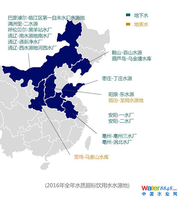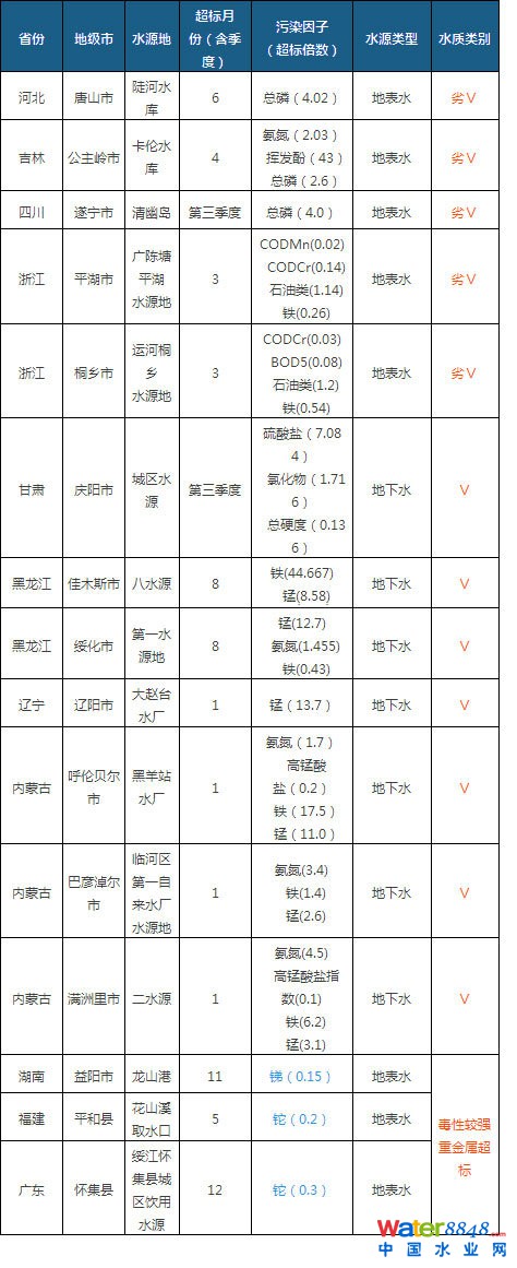 各省水質(zhì)超標水源地中,竟然有16個全年12個月持續(xù)超標。