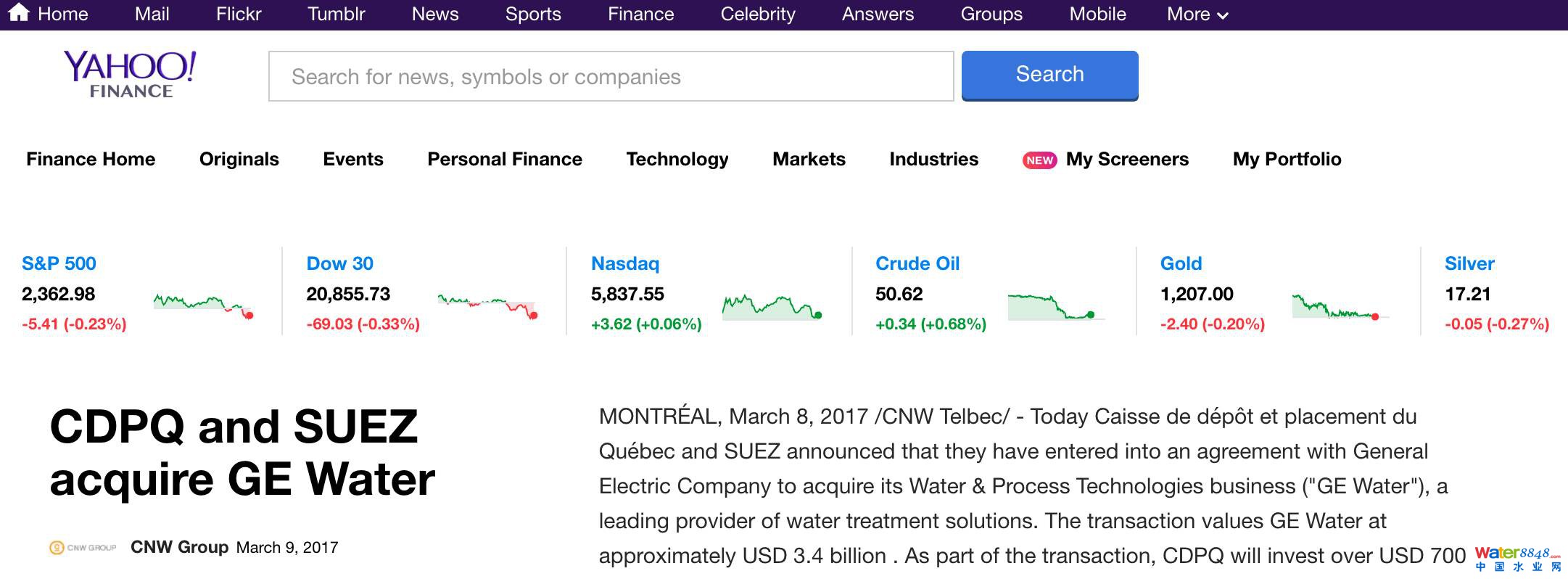 水行業(yè)巨頭法國(guó)蘇伊士環(huán)境聯(lián)合加拿大第二大養(yǎng)老金投資管理機(jī)構(gòu)—魁北克儲(chǔ)蓄投資集團(tuán)(Caisse de dép?t et placement du Québec )正式確認(rèn)收購(gòu)GE水處理。GE水處理是在2016年10月宣布出售的,之后曾出現(xiàn)過(guò)諸如威立雅、全球最大儀器公司丹納赫集團(tuán)(Danaher Corporation)、著名的私人股權(quán)投資和投資管理公司黑石集團(tuán)(Blackstone Group)等潛在買(mǎi)家的傳聞。 在上個(gè)月底,蘇伊士環(huán)境的新聞發(fā)言人也對(duì)外宣布正在考慮收購(gòu)GE工業(yè)水處理業(yè)務(wù)的可能性。是什么讓蘇伊士在官宣之后的半個(gè)月內(nèi)就完成這宗收購(gòu)呢?今天我們將帶大家看看全球各大媒體對(duì)這次收購(gòu)的解讀。