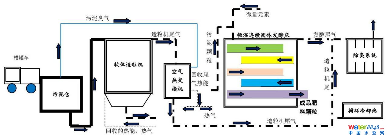 造粒區(qū)域完成將污泥(通過自重)造粒后,形成含水量在60%的顆粒污泥,進入恒溫連續(xù)固體發(fā)酵床,顆粒具有較強的分散度,很高的透氣性強化了好氧發(fā)酵強度。