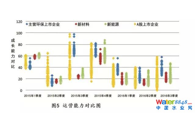在李寶娟看來(lái),環(huán)保產(chǎn)業(yè)發(fā)展受經(jīng)濟(jì)周期性的影響相對(duì)較小,營(yíng)運(yùn)能力較弱成為當(dāng)前A股環(huán)保上市企業(yè)發(fā)展的主要阻力。2015年1季度至2016年3季度,環(huán)保上市企業(yè)始終處于A股上市企業(yè)的中下游位置,表明環(huán)保企業(yè)需通過(guò)優(yōu)化資產(chǎn)配置利用,科學(xué)合理地提升自身營(yíng)運(yùn)能力。(圖5)