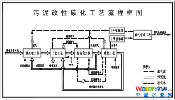 本項目的主工藝路線為:原泥與改性劑以及改性后的污泥在預(yù)處理工段混合---干化工段---脂轉(zhuǎn)化工段---碳化工段---煙氣合成工段---尾氣達標排放,其整體工藝流程框圖如圖所示。