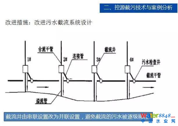 這里我重點在控源截污技術(shù)進行講解。從源頭控制污水向城市水體排放是黑臭水體整治最有效的工程措施,也是其它技術(shù)措施的前提。從很多地方一提到減排就想把原有的河流改成分流制,改的過程中發(fā)現(xiàn)難度相當大,所以我們感覺相當一段時間里我們還是合流制跟分流制并存的狀態(tài)。截流式合流制排水系統(tǒng)改造看似簡單,其實遠非如此,考慮到不同地方差異較大,且對截流井方面的設(shè)置方面的重視程度不夠,有些地方照抄照搬,截流系統(tǒng)設(shè)置不合理,往往影響到整個污水管網(wǎng)系統(tǒng)和處理設(shè)施的運行,影響到黑臭水體的治理效果。