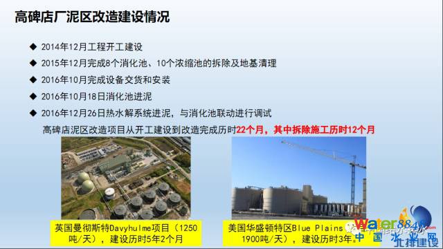 整個(gè)高碑店污泥處置中心建設(shè)改造情況為:2014年12月底開(kāi)始工程建設(shè);2015年12月完成8個(gè)消化池、10個(gè)濃縮池的拆除及地基清理工作;2016年10月完成設(shè)備交貨和安裝;2016年10月18日消化池進(jìn)泥,2016年12月26日熱水解系統(tǒng)進(jìn)泥,與消化池聯(lián)動(dòng)進(jìn)行調(diào)試。高碑店泥區(qū)改造項(xiàng)目從開(kāi)工建設(shè)到改造完成歷時(shí)22個(gè)月,其中拆除施工歷時(shí)12個(gè)月,相比國(guó)外同等建設(shè)規(guī)模、體量相近的英國(guó)曼徹斯特的項(xiàng)目、美國(guó)華盛頓特區(qū)Blue Plains 項(xiàng)目,我們大大縮短項(xiàng)目工程建設(shè)周期。