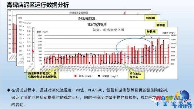 在調(diào)試過(guò)程中,通過(guò)對(duì)消化池溫度、PH值、VFA/TAC、氨氮和游離氨等數(shù)據(jù)的監(jiān)測(cè)和控制,保證了消化池在負(fù)荷提高時(shí)的穩(wěn)定運(yùn)行,同時(shí)平穩(wěn)度過(guò)微生物的轉(zhuǎn)換期,成功完成整個(gè)系統(tǒng)的啟動(dòng)。隨著熱水解滿(mǎn)負(fù)荷運(yùn)行以來(lái),板框脫水機(jī)的效果未受到影響,出泥含水率基本保持在60%以下,平均含水率為54.7%。