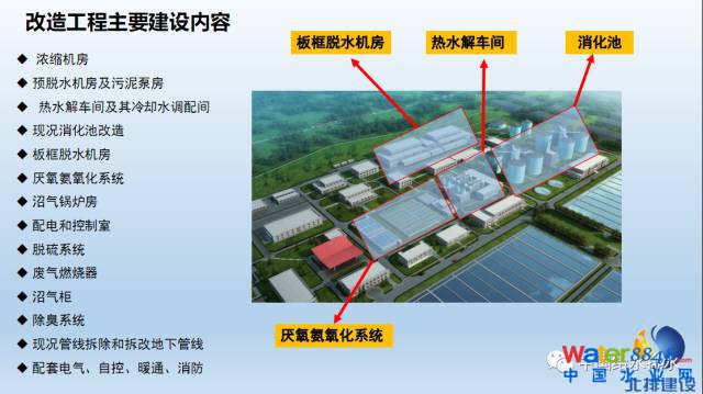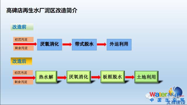 關(guān)于改造前和改造后的高碑店污泥處置中心的工藝路線(xiàn),主要就是新增了熱水解單元,對(duì)原有的消化池進(jìn)行了改造,新增板框脫水機(jī)房,同時(shí)板框?yàn)V液采用了北排研發(fā)的紅菌技術(shù),這是整個(gè)改造工程的主要的建設(shè)內(nèi)容。