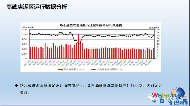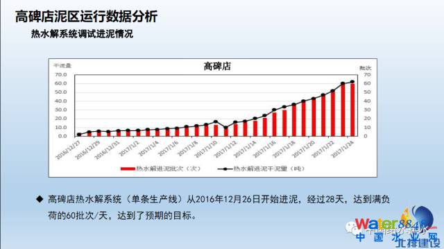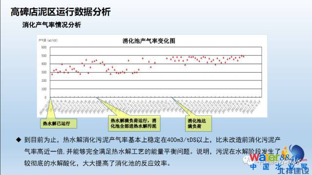 下面介紹一下具體的調(diào)試情況。高碑店熱水解系統(tǒng)(單條生產(chǎn)線(xiàn))從2016年12月26日開(kāi)始進(jìn)泥,經(jīng)過(guò)28天,達(dá)到滿(mǎn)負(fù)荷的60批次/天,達(dá)到了預(yù)期的目標(biāo)。同時(shí),在熱水解進(jìn)泥濃度滿(mǎn)足設(shè)計(jì)值的情況下,蒸汽消耗量基本保持在1.1t/tDS,達(dá)到設(shè)計(jì)要求;到目前為止,熱水解消化污泥產(chǎn)氣率基本上穩(wěn)定在400m3/tDS以上,比未改造前消化污泥產(chǎn)氣率高近一倍,并能夠完全滿(mǎn)足熱水解工藝的能量平衡問(wèn)題。說(shuō)明,污泥在水解階段發(fā)生了較徹底的水解酸化,大大提高了消化池的反應(yīng)效率。在圖表中我們可以看到隨著熱水解的啟動(dòng),產(chǎn)氣率逐漸從不到三百慢慢提升,一直穩(wěn)定在400左右,甚至高的時(shí)候可以接近500。