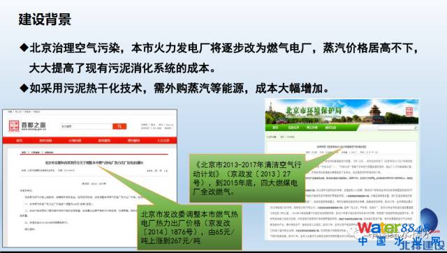 同時(shí)因?yàn)楸本┲卫砜諝馕廴,北京的火力發(fā)電廠將逐步改為燃?xì)怆姀S,蒸汽價(jià)格居高不下,導(dǎo)致現(xiàn)有污泥消化系統(tǒng)的成本將增高。同時(shí)如果采用污泥的熱干化技術(shù),需要大量外購(gòu)蒸汽等能源,未來(lái)的運(yùn)行成本將大幅度增加。
