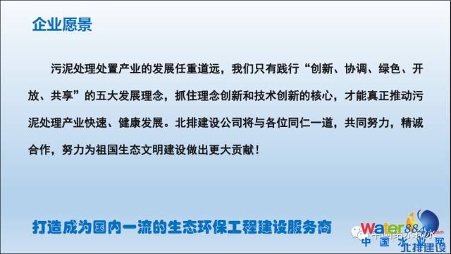 最后,污泥處理處置產(chǎn)業(yè)的發(fā)展任重道遠(yuǎn),我們只有踐行“創(chuàng)新、協(xié)調(diào)、綠色、開(kāi)放、共享”的五大發(fā)展理念,抓住理念創(chuàng)新和技術(shù)創(chuàng)新的核心,才能真正推動(dòng)污泥處理產(chǎn)業(yè)快速、健康發(fā)展。北排建設(shè)公司將與各位同仁一道,共同努力,精誠(chéng)合作,努力為祖國(guó)生態(tài)文明建設(shè)作出更大貢獻(xiàn)!