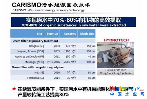 第一個新技術(shù)是“CARISMO”污水能源回收技術(shù),該技術(shù)能實現(xiàn)污水之中70%-80%有機(jī)物的高效提取,并將提取的有機(jī)物質(zhì)轉(zhuǎn)到厭氧消化的環(huán)節(jié),從而實現(xiàn)污水之中有機(jī)物能源化的利用,沼氣的產(chǎn)量提升80%。